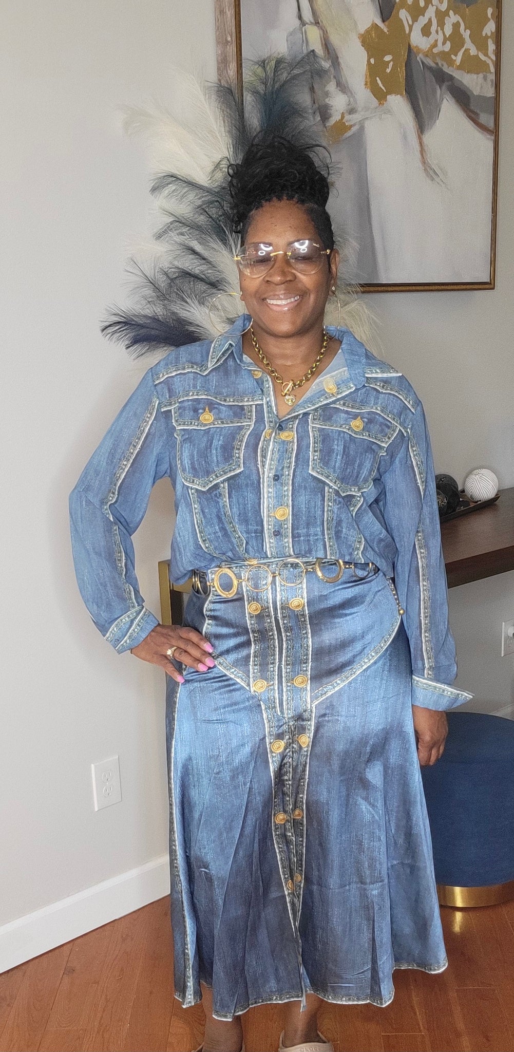 2 piece satin denim print skirt set, shirt is button down, skirt is flare with side split, has stretch