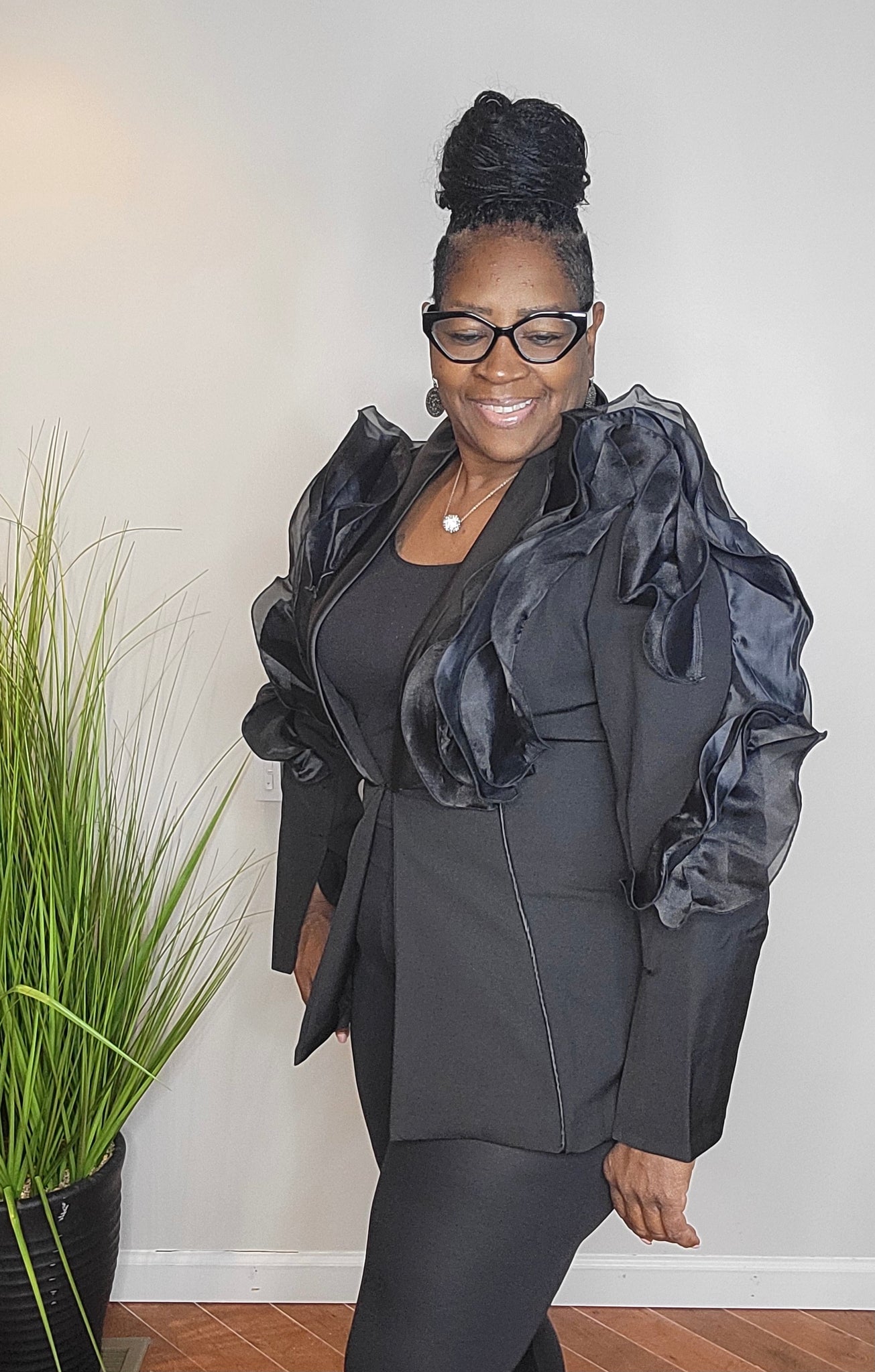 Elegant styled blazer with front hook and latch, puff sleeves with satin lapel and details on the arms