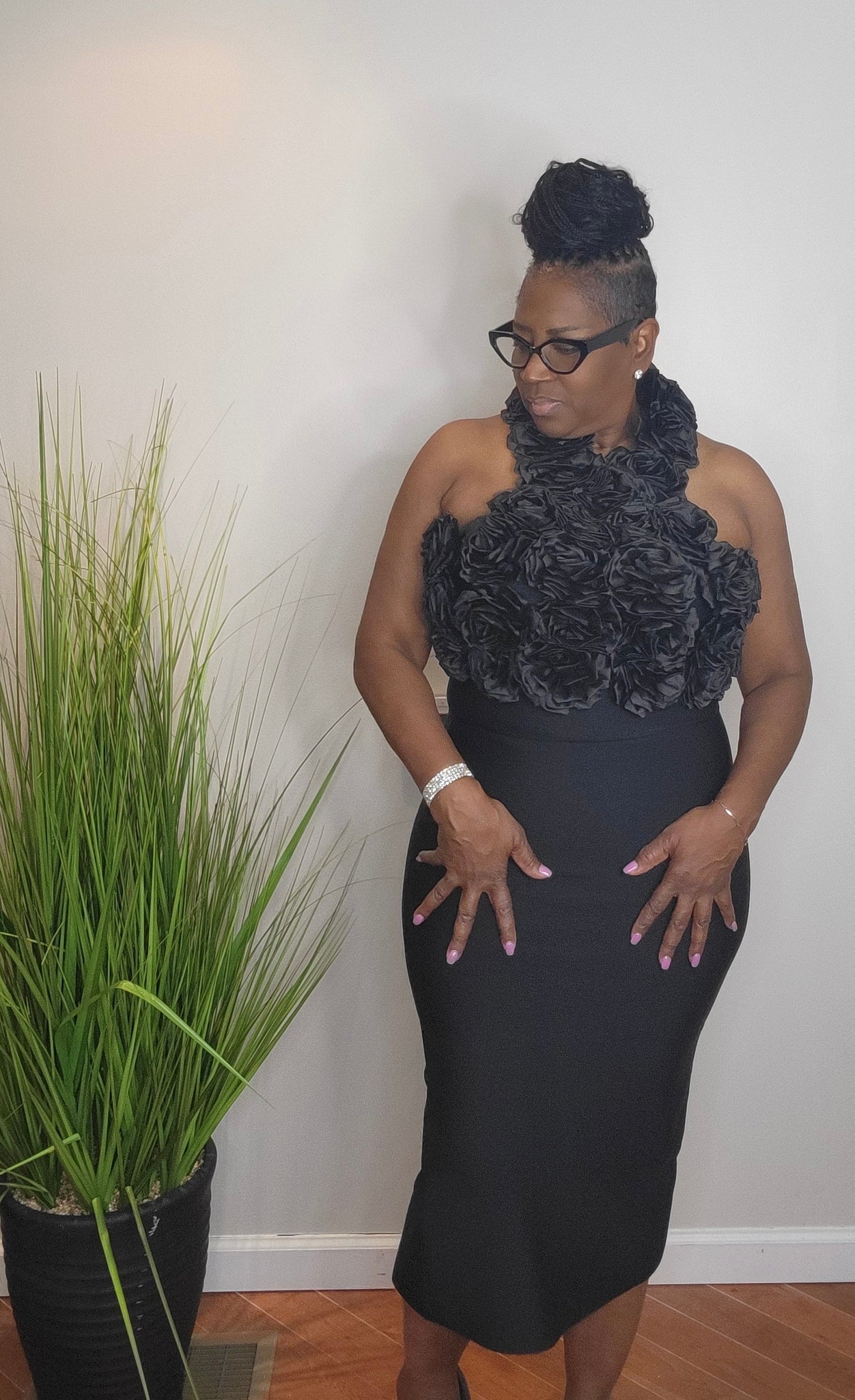 Bodycon stretchy backout halter dress with flower petals around the neckline