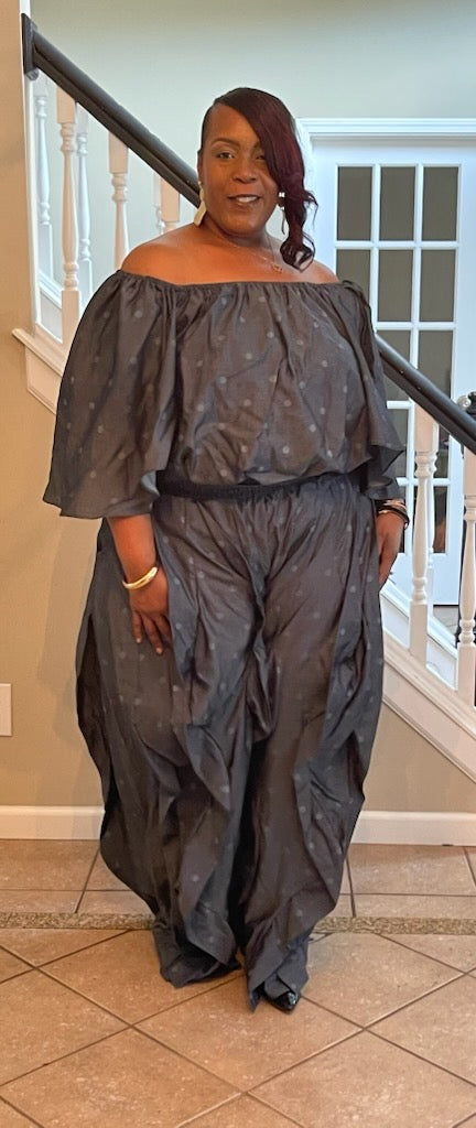 2 piece navy dotted pant set, high waisted pants, wide legged with cropped off the shoulder top, pants have pockets